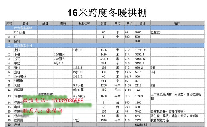 本篇文章小編主要為大家整理的是搭一畝大棚需要多少錢?一畝地溫室大棚的造價清單,文中主要圍繞著16米大跨度日光溫室、16米跨度冬暖拱棚、10米跨度幾字鋼日光溫室、8米跨度全鋼架拱棚等。小編會依次為大家提供這幾種大棚的圖紙及報價預算(每畝地的造價),更多類型的溫室大棚預算可以添加小編微信:15332036888。
