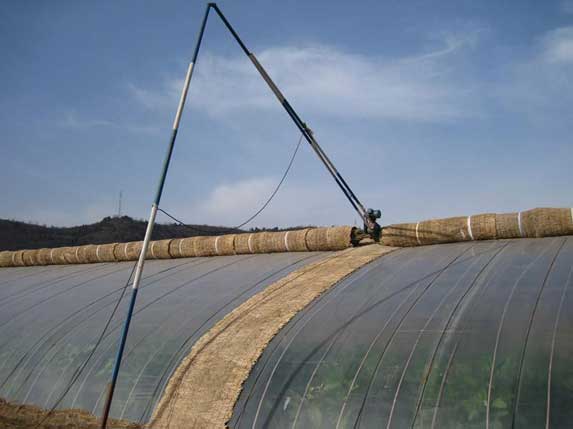 13. 啟動卷簾機時,操作人員要手持開關站在大棚兩山或后墻上,棚前嚴禁有人,要遠離立桿和卷動的草簾。向上卷至離棚頂30厘米左右,必須停機。如出現剎車失靈,速將控制開關置于倒方向,使卷簾機正常放下,待停穩斷電后再檢修。如草簾或保溫被出現略有走偏的現象,應及時自行調整。